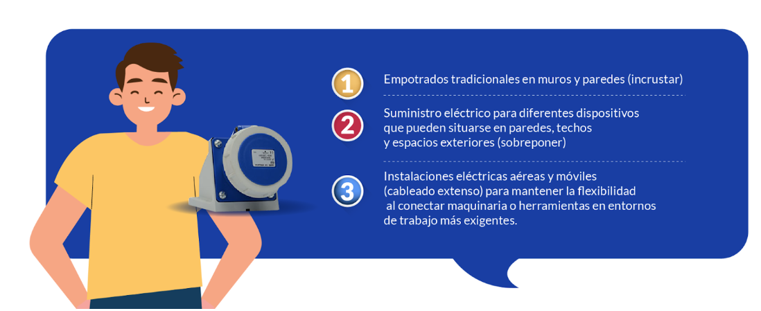 • Anticorrosión: soporte ante el deterioro causado por agentes electroquímicos como agua marina, hidruros de azufre, vapor, entre otros. Especialmente importante para las clavijas industriales de empresas agrícolas, petroleras, energéticas, estadios, aeropuertos, plantas de tratamiento, etc.